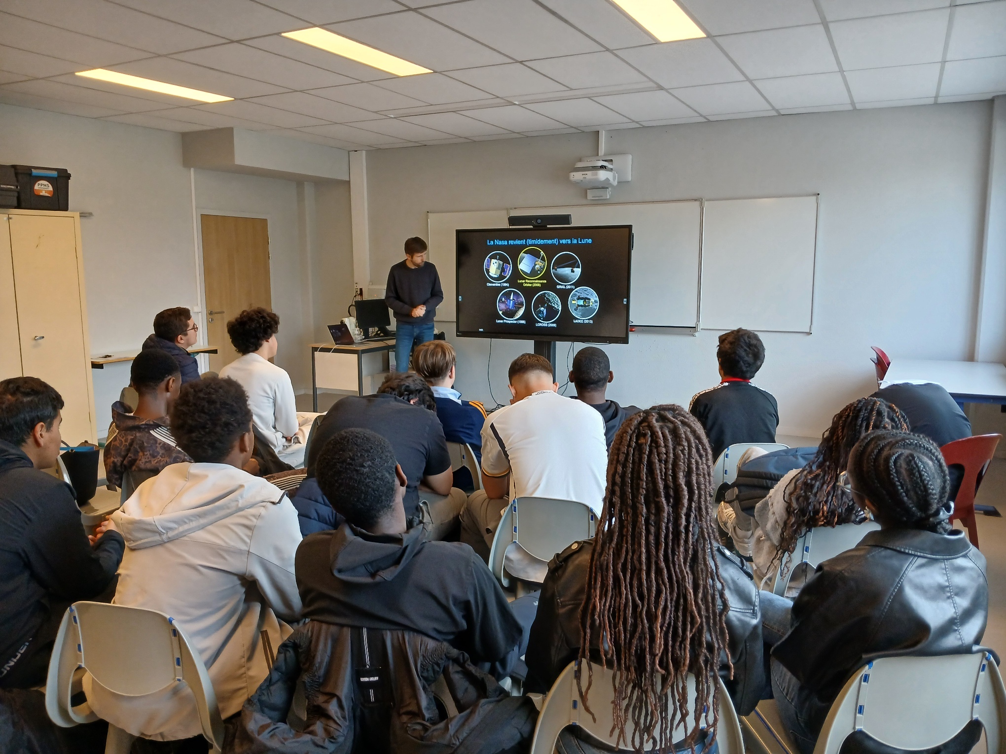 Les élèves de la classe ont pu échanger avec ce scientifique durant près de 2h00 sur le sujet de l'exploration lunaire en abordant l'historique des différentes missions robotisées, les missions américaines Apollo, mais aussi celles en cours et futures dont le programme Artémis qui doit permettre aux hommes de retourner sur notre satellite naturelle.